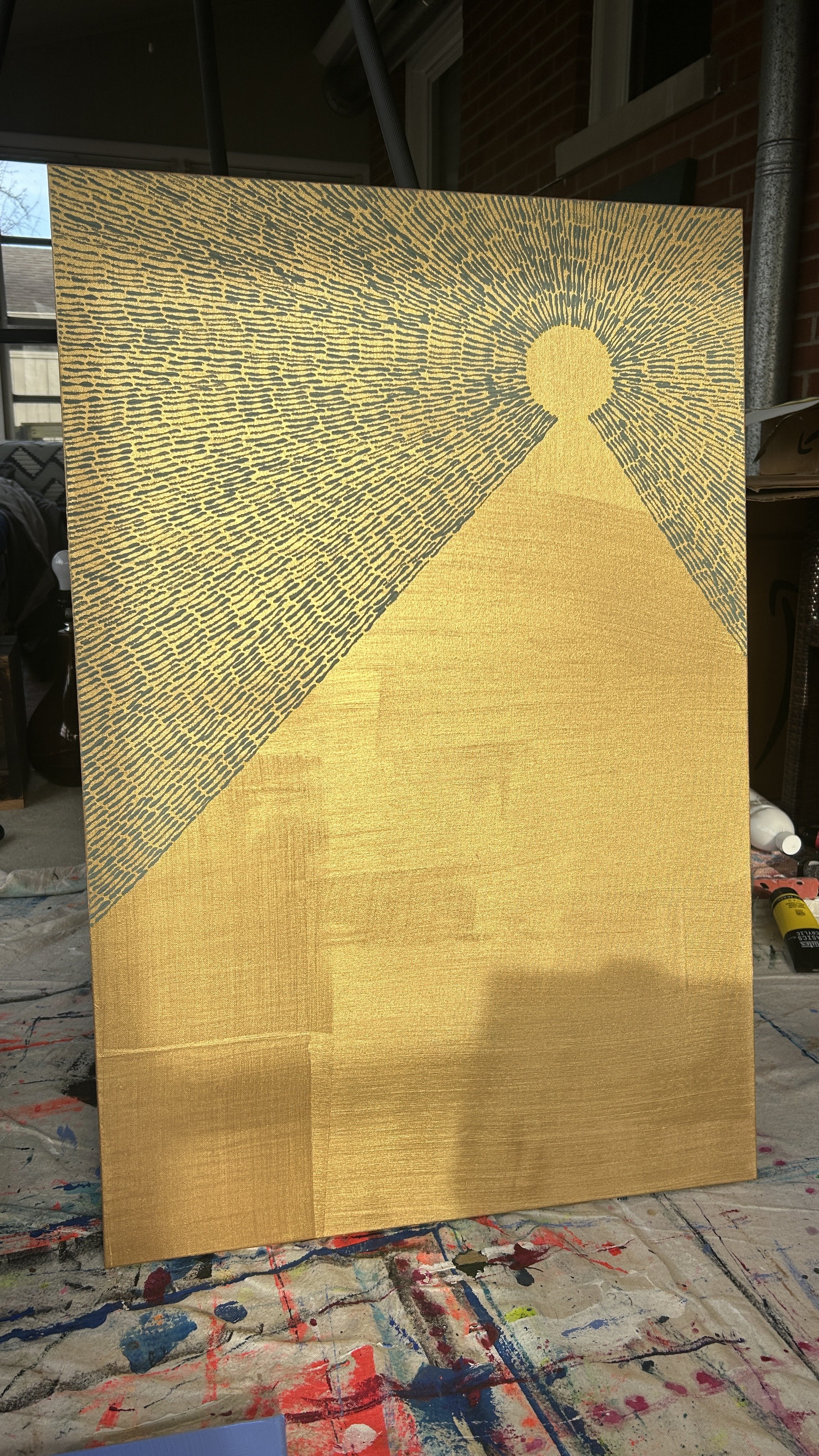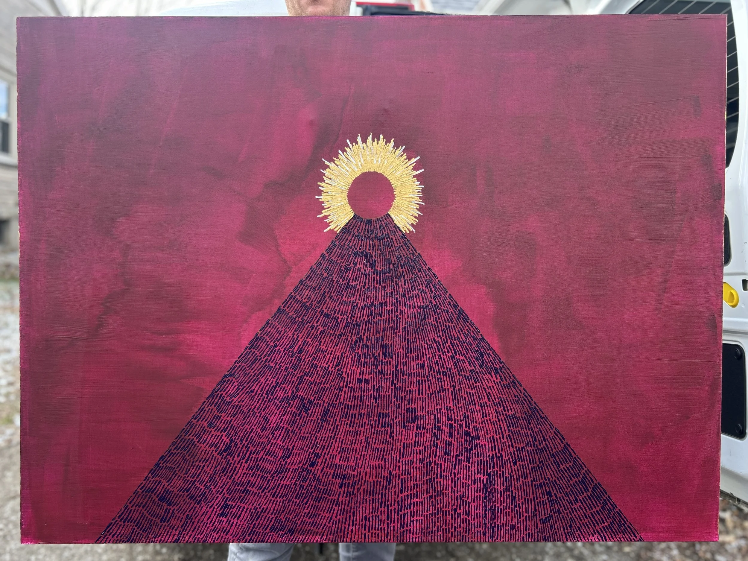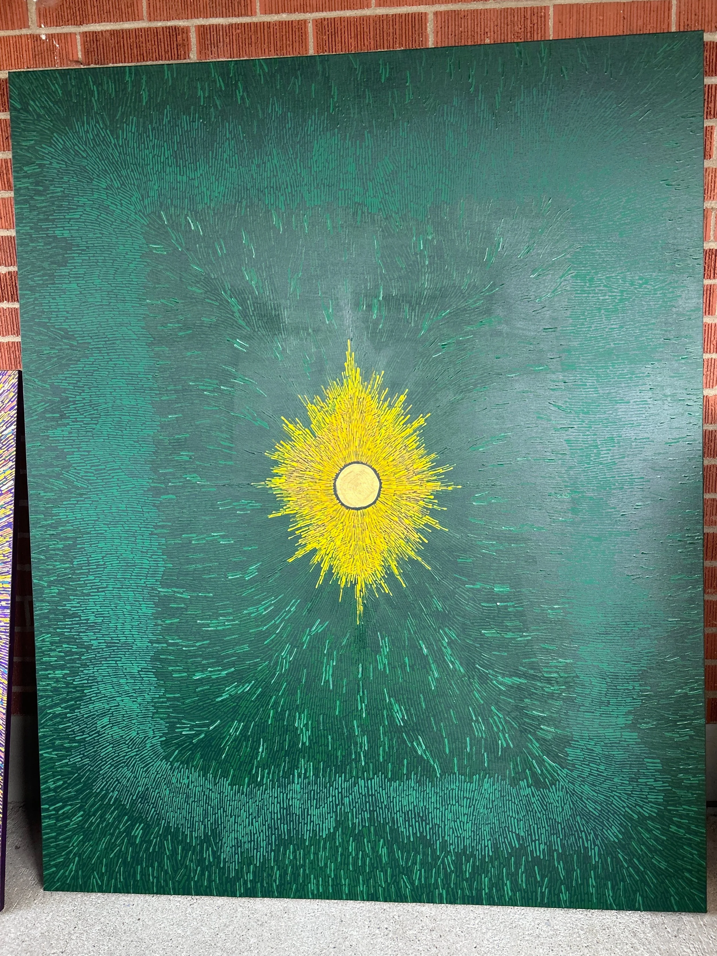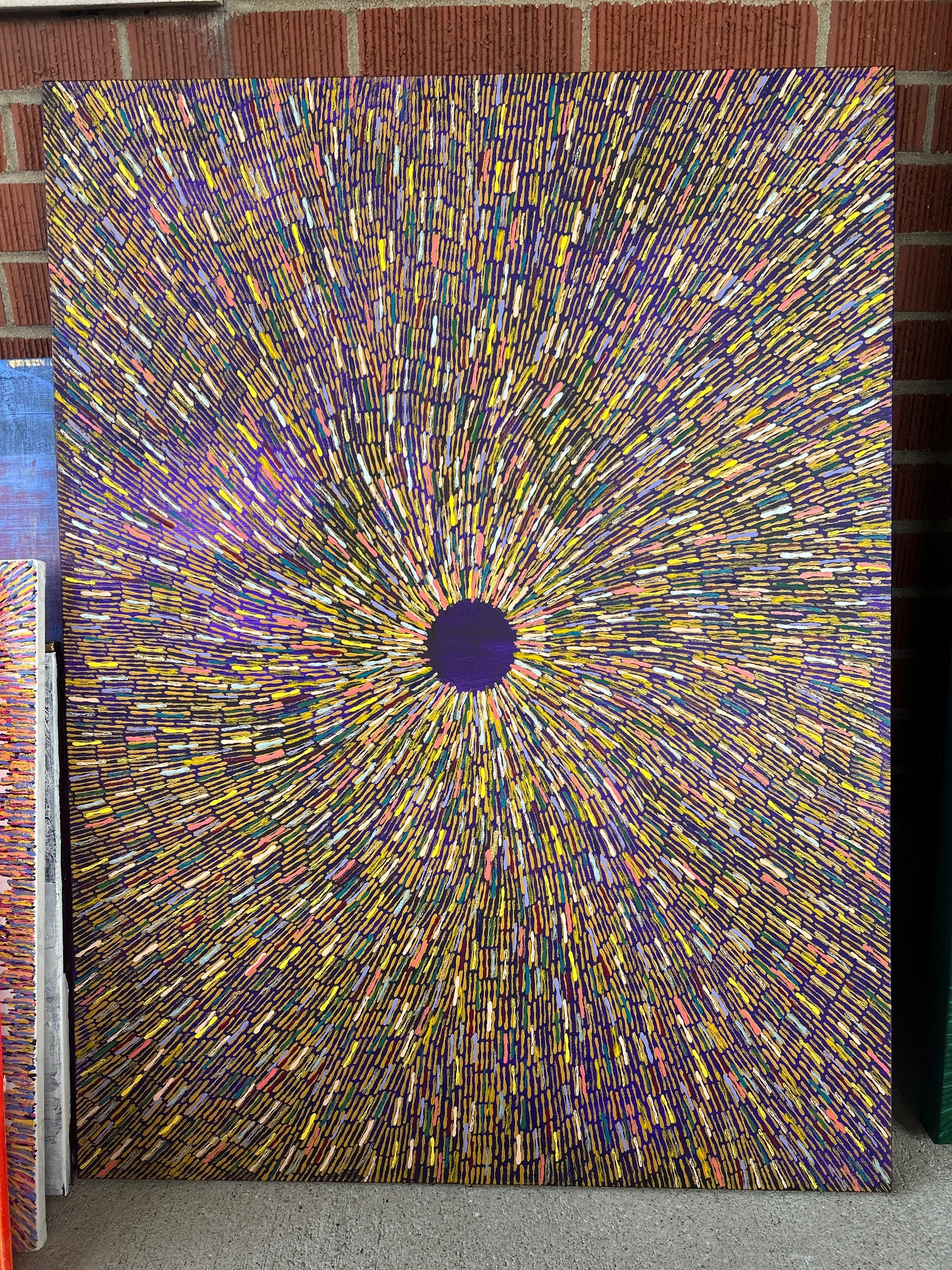 "be here now" is a meditation on how we choose to spend the currencies of our time and attention in the minute-to-minute, day-to-day of our lives. Each individual paint stroke is a singular choice in the context of many, highlighting how repetition, no matter how mundane or everyday, can be sacred.